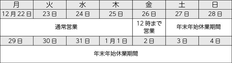 年末年始休業期間:2025年12月27日(土)~2026年1月4日(日)